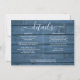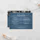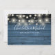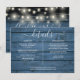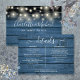 Uma elegante carta de informações de detalhes do casamento com luzes de corda personalizada com seus detalhes especiais em uma tipografia elegante e seus nomes e data de casamento no verso em um fundo de madeira rústica azul. Projetado por Thisisnotme