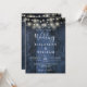 Este convite de casamento com luzes de corda de madeira rústica azul tudo-em-um pode ser personalizado com suas informações em tipografia moderna e detalhes do casamento no verso. Projetado por Thisisnotme