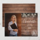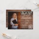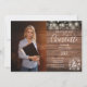 Um convite de festa de formatura rústico elegante com lindas luzes de corda, potes de conserva, nomes de estilo de assinatura e tipografia chic em um fundo de madeira rústica azul, personalizado com a foto do seu graduado e detalhes da celebração. Projetado por Thisisnotme©