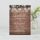 Um convite de casamento rústico elegante com luzes de corda bonitas, nomes de estilo de assinatura e tipografia chic em um fundo de madeira rústica. Projetado por Thisisnotme