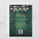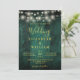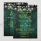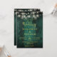 Este convite de casamento com luzes de corda de madeira rústica verde esmeralda pode ser personalizado com suas informações em tipografia dourada moderna e código QR do site de casamento no verso. Criado por Thisisnotme©
