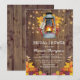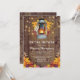 Convites rústicos de campo para festa de noiva com fundo de celeiro de madeira, folhas de outono, lanterna acesa, luzes cintilantes e um modelo de noiva moderno.