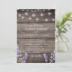 Convite de casamento com impressão em madeira rústica e luzes de corda lavanda e branca.