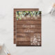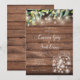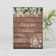 Um convite de casamento de jardim country chique com belas luzes de corda, potes de pedra e folhas frescas naturais de eucalipto, emoldurando os detalhes do seu casamento em escrita elegante e tipografia clássica sobre um fundo de madeira rústica. Projetado por Thisisnotme