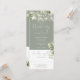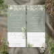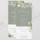 Um convite de casamento verde sage tudo-em-um com lindas luzes de corda, folhagens botânicas rústicas e tipografia elegante. O convite inclui um cartão de RSVP que pode ser destacado e detalhes de informações para convidados. Criado por Thisisnotme©