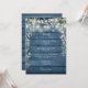 Lindas luzes de corda e uma cascata de verde floral lindo emolduram os detalhes da sua celebração de casamento especial definida em tipografia elegante em um fundo de madeira rústica azul. Criado por Thisisnotme