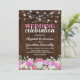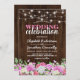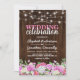 Convites de casamento country chic com fundo de madeira rústica, luzes de corda de quintal, flores de aquarela elegantes em rosa e branco, e um modelo de celebração de casamento fácil de personalizar.