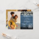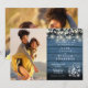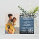 Um convite de casamento elegante com suas 2 fotos especiais e folhas de salvia e lilás, luzes de corda, jarras de mason e os detalhes do seu casamento em texto elegante sobre um fundo de madeira rústica azul. Criado por Thisisnotme