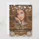 Lindo desenho rústico com cordas de luzes brilhantes sobre madeira e adoráveis acentos de canto em renda falsa para este convite de festa com modelo de foto único