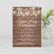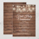 Um convite rústico de primeira comunhão com lindas luzes de corda e seus detalhes personalizados especiais em uma tipografia elegante sobre um fundo de painéis de madeira. Concebido por Thisisnotme©