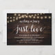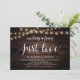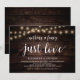 Linda Simplicidade, Só Amor, Convite de Anúncio / Festa de Casamento, em design Rústico Moderno, Luzes de Corda na Fazenda, tema de papel marrom madeira. Isto é perfeito para a recepção do seu casamento e festa de celebração pós-casamento. Adicione seus detalhes em fonte / letra correspondente.