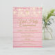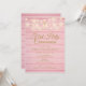 Um convite rústico para a primeira comunhão com lindas luzes de corda e seus detalhes personalizados especiais em tipografia dourada elegante sobre um fundo de painéis de madeira rosa. Concebido por Thisisnotme©