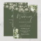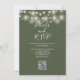 Este convite de casamento elegante verde oliva, apresentando lindas luzes de corda e folhagens florais, pode ser personalizado com suas informações em tipografia sofisticada com os detalhes do seu site de casamento e seu código QR no verso. Projetado por Thisisnotme©