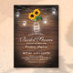Modelo de convite de chá de panela country chic com um fundo de madeira rústica de celeiro, suas iniciais impressas em burlap enrolado em torno de um pote de mason, luzes de corda, girassóis amarelos brilhantes e um modelo de texto de chá de panela que é fácil de personalizar.