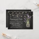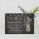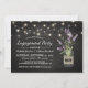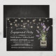 Convites de festa de noivado country chic com um fundo rústico de quadro-negro preto, luzes de corda, um jarro de flores de lavanda roxa, envolto em aniagem com as iniciais do casal e um modelo de festa fácil de personalizar.