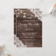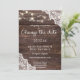 As coisas mudam. Envie aos seus convidados um lindo convite de mudança de data de casamento devido a este convite de madeira azul e renda com luzes de cordão. Ótimo para casamentos no campo e no quintal.