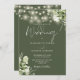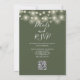 Este elegante convite para o casamento verde-oliva, com luzes bonito de cordas e verde floral, pode ser personalizado com suas informações em tipografia quic com os detalhes do seu website de casamento e seu código QR no sentido inverso. Projetado por Thisnotme©