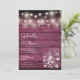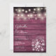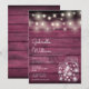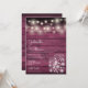 Um convite de casamento rústico elegante com lindas luzes em forma de cordão e jarras de pedreiro. Os nomes do casal feliz estão escritos em uma fonte elegante acima dos detalhes especiais do casamento em um fundo de madeira borgonha rústica. O verso apresenta um fundo de madeira rústica correspondente. Criado por Thisisnotme©