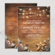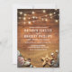 Convites de casamento de destino na praia com um cenário de celeiro de madeira rústica, luzes cintilantes, praia arenosa com estrela-do-mar e conchas.