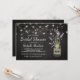 Modelo de convite de chá de panela com tema country chic, apresentando um fundo rústico de quadro-negro, luzes de corda, um jarro de flores de lavanda roxa, envolto em aniagem com as iniciais do casal e um modelo de chá de panela que é facilmente personalizado.