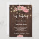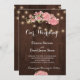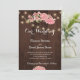 Camponeses cor-de-rosa com pincel floral e luzes brilhantes sobre madeira castanha escura de fundo fazer de um convite de casamento rústico da moda do país. O convite é ideal para elegantes festas ao ar livre, jardins, primavera, verão, casamentos outono ou outras partes.
