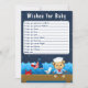 Este belo e divertido cartão de bebê apresenta um macaco-marinheiro náutico num pavimento de madeira com uma gaivota e um caranguejo. Ao fundo há um pássaro vermelho giro em um veleiro, ondas oceânicas e um marinho azul estrelado céu noturno. O texto combina fontes em negrito e sem serifa para uma aparência na moda e moderna. Isto é perfeito para um chá de fraldas temático náutico.