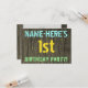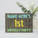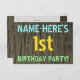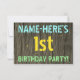Este design de convite de aniversário divertido apresenta uma mensagem como "NAME-HERE'S primeiro aniversario PARTITY!", onde o nome pode ser personalizado, na frente. O fundo apresenta um padrão de aparência rústico, castanho e falso em grãos de madeira. O texto de mensagem personalizável na frente apresenta cores como azul, amarelo e verde, e tem uma aparência inspirada pelo texto pintado e estêncilhado. A parte traseira contém uma mensagem personalizada que pode incluir detalhes importantes sobre a festa de aniversário, como quando e onde ela está sendo mantida, juntamente com qualquer outra informação relevante. Convites de festas de aniversários como esta podem ser uma maneira divertida de convidar a família e os amigos para uma festa de aniversário que está sendo realizada para alguém que está comemorando seu primeiro aniversário. [~Z0000291]