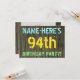 Este design de convite de aniversário divertido apresenta uma mensagem como "NAME-HERE'S 94th FESTA DE ANIVERSÁRIO!", onde o nome pode ser personalizado, na frente. O fundo apresenta um padrão de aparência rústico, castanho e falso em grãos de madeira. O texto de mensagem personalizável na frente apresenta cores como azul, amarelo e verde, e tem uma aparência inspirada pelo texto pintado e estêncilhado. A parte traseira contém uma mensagem personalizada que pode incluir detalhes importantes sobre a festa de aniversário, como quando e onde ela está sendo mantida, juntamente com qualquer outra informação relevante. Convites de festas de aniversários como esta podem ser uma maneira divertida de convidar a família e os amigos para uma festa de aniversário que está sendo realizada para alguém que está comemorando seu 90º aniversário. [~Z0000291]