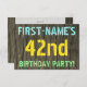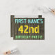 Este design de convite de aniversário divertido apresenta uma mensagem como "A 42ª FESTA DE ANIVERSÁRIO do FIRST-NAME!", onde o nome pode ser personalizado, na frente. O fundo apresenta um padrão de aparência rústico, castanho e falso em grãos de madeira. O texto de mensagem personalizável na frente apresenta cores como azul, amarelo e verde, e tem uma aparência inspirada pelo texto pintado e estêncilhado. O verso apresenta uma mensagem personalizada que pode incluir detalhes relevantes sobre a festa de aniversário, como quando e onde ela está sendo mantida, juntamente com qualquer outra informação que seja importante. Convites de festas de aniversários como esta podem ser uma maneira divertida de convidar a família e os amigos para uma festa de aniversário que está sendo realizada para alguém que está celebrando seu quarenta e segundo aniversário. [~Z0000291]