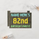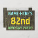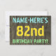 Este design de convite de aniversário divertido apresenta uma mensagem como "NAME-HERE'S 82nd FESTA DE ANIVERSÁRIO!", onde o nome pode ser personalizado, na frente. O fundo apresenta um padrão de aparência rústico, castanho e falso em grãos de madeira. O texto de mensagem personalizável na frente apresenta cores como azul, amarelo e verde, e tem uma aparência inspirada pelo texto pintado e estêncilhado. O verso apresenta uma mensagem personalizada que pode incluir detalhes relevantes sobre a festa de aniversário, como quando e onde ela está sendo mantida, juntamente com qualquer outra informação que seja importante. Convites de festas de aniversários como esta podem ser uma maneira divertida de convidar a família e os amigos para uma festa de aniversário que está sendo realizada para alguém que está celebrando seu oitenta e segundo aniversário. [~Z0000291]