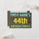 Este design convite de aniversário de 44 divertido apresenta uma mensagem como "FESTA DE ANIVERSÁRIO do PRIMEIRO NOME!", onde o nome pode ser personalizado, na frente. O fundo apresenta um padrão de aparência rústico, castanho e falso em grãos de madeira. O texto de mensagem personalizável na frente apresenta cores como azul, amarelo e verde, e tem uma aparência inspirada pelo texto pintado e estêncilhado. A parte traseira contém uma mensagem personalizada que pode incluir detalhes importantes sobre a festa de aniversário, como quando e onde ela está sendo mantida, juntamente com qualquer outra informação relevante. Convites de festas de aniversários como esta podem ser uma maneira divertida de convidar a família e os amigos para uma festa de aniversário que está sendo realizada para alguém que está comemorando seus quarenta e quatro anos. [~Z0000291]