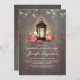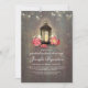 O antigo convite para festa de formatura de madeira rústica com a lanterna vintage metal com flores de velas, rosa e brancas, e fios românticos de cordas