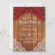 Madeira rústica elegante e convite de renda decorados com rosas vermelhas.