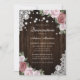 Lindos convites de festas florais cor-de-rosa com uma bela pincelada, com flores rosa-pinceladas, contra um fundo de madeira de celeiro adornado com rendas florais brancas e luzes de cordas. Coração de buracos com iniciais no fundo. Personalize facilmente a Internet.