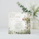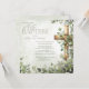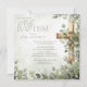 Um convite à aquarela moderno para o batismo sagrado em cores verdes de sábio macio e fundo verde claro. Projetado para um bebê batismo, apresentando uma doce ilustração de flores ao lado de uma cruz de madeira. Convide seus amigos e família para seu batismo sagrado em estilo com este cartão bonito. O uso do script e da fonte serif clássica cria um visual moderno elegante.