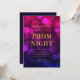 Convite de baile elegante com as palavras "Noite de Baile" em folha de ouro falso sobre um fundo com padrão de luzes bokeh azul magenta. O convite tem um verso com fundo roxo escuro.
