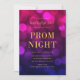 Convite de baile de gala com as palavras "Noite de Baile" em folha de ouro falso contra um fundo de luzes bokeh magenta azul. O convite tem um verso com fundo roxo escuro.
