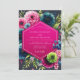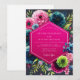 A dramatic backdrop of deep, dark hues serves as the canvas for lush, vibrant floral elements. Bold magenta, teal, and lime green blossoms intertwine with rich green foliage, creating a captivating, moody aesthetic. This design evokes an atmosphere of opulent romance.