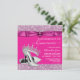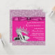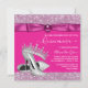 Magenta rosa-quente Quinceañera convida com belas calçados de salto alto e brilho prateado e tiara diamante em um elegante fundo de vidro de arco rosa-quente magenta. Este convite para Quinceañera, cor-de-rosa-quente e preto, é facilmente personalizado com os seus detalhes. Você também pode alterar a cor de fundo na frente e no verso.