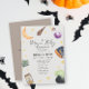 Divirta-se com um chá de fraldas de halloween com nosso adorável convite. O design apresenta ilustrações aquarelas de uma variedade de pequenos elementos mágicos bonitinhos, juntamente com uma tipografia escrita à mão para complementar o olhar com um cabeçalho que lê "Um bebê mágico está se formando". Todo texto é 100% personalizável. Excelente para um chá de fraldas de halloween neutro em termos de gênero.