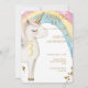 Unicorn birthday party. Yellow, pink and turquoise birthday party invitation. Young girl birthday party invite. Rounded. Rainbow. Magical day. White background.