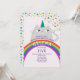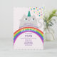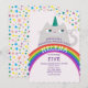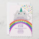 Bonita, feminina, mágica, convite de aniversário do arco-íris para crianças, com estrelas coloridas e unicórnio de gato kawaii.