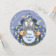 O velho feiticeiro com capa azul e bola mágica de cristal. Use a foto facial para personalizar. Texto personalizado.