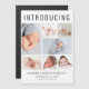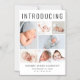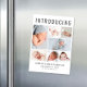 Um ímã de anúncio de nascimento de manutenção de chic para apresentar seu bebê recém-nascido a amigos e familiares apresentando "Apresentação" em letras grandes, uma colagem de sete fotos e seu nome, data de nascimento e estatísticas de nascimento em uma simples tipografia moderna.