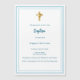 Um fundo branco, decorado com um quadro azul claro, e um ouro cruza Personalize e adicione o nome e os detalhes. Texto branco.