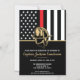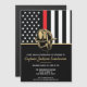Este design apresenta uma bandeira de bombeiros com listras pretas e brancas, e uma fina faixa vermelha também. O capacete de bombeiro está acima de todos os detalhes da festa para o bombeiro aposentado, tenente ou festa de aposentadoria do chefe. Os convites também podem ser personalizados para um bombeiro aposentado.