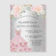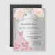 Um convite moderno, na moda e glamouroso para uma Quinceañera, festa de aniversário 15. Um fundo metálico prateado sujo, com poeira brilhante rosa e falso, um vestido e flores cor-de-rosa. O nome é escrito com um moderno estilo escrito à mão. Personalize e adicione os detalhes da sua festa.