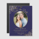 These beautiful wedding save the date cards feature an elegant navy blue and gold design with your photo in an oval shaped frame with ornate golden curls and swirls in the corners. The title is written in lacy script lettering and there is space for your names, the date, and wedding location. Great way to make it easy for your friends and family to remember your upcoming wedding date. The magnetic back makes these cards easy to display on a refrigerator or other metal surface.