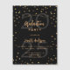 Um cartão de convite glamouroso para uma festa de formatura para ele e para ela. Um fundo preto decorado com estrelas douradas falsas. Personalize e adicione um nome, ano e detalhes da festa. O texto Graduação e o nome são escritos com um script de estilo moderno, escrito à mão. Texto colorido do ouro.