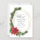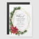 Convite de casamento magnético de Natal rústico moderno com moldura geométrica dourada e tipografia manuscrita com sinos de trenó, flores de poinsettia, azevinho, visco e pinheiro.